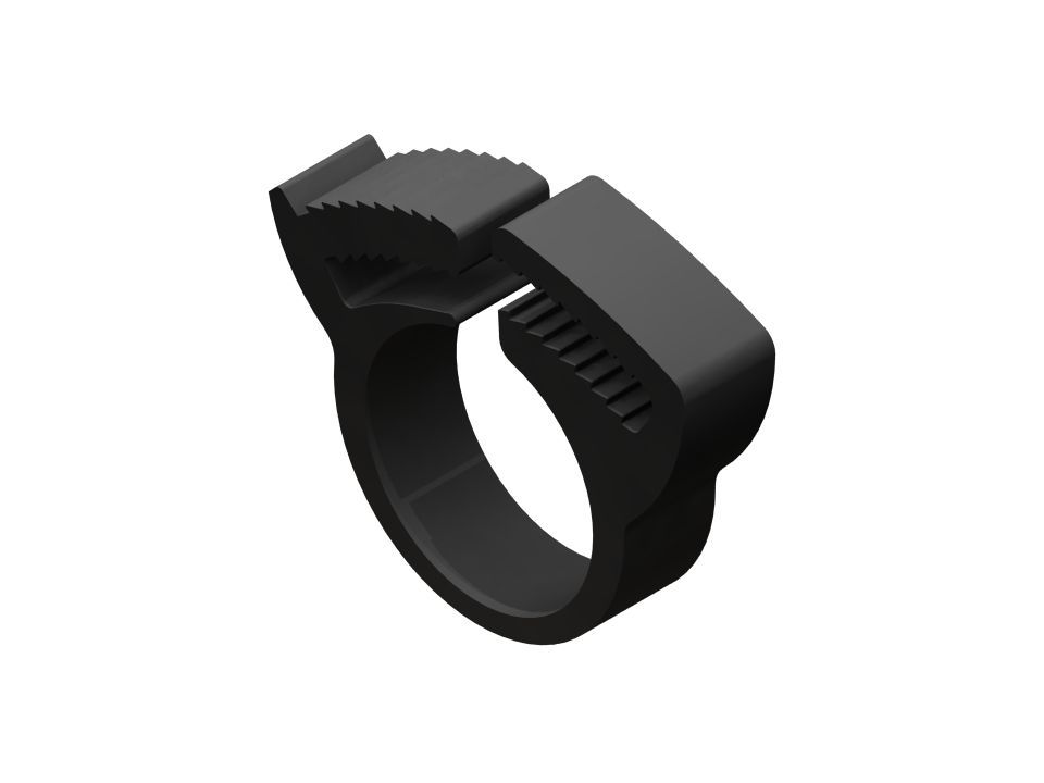 - Thread the first few threads and tighten the jaws to fit around the hose. When it is necessary to remove, moving the jaw to the opposite side frees the teeth. Reusable without loss of performance