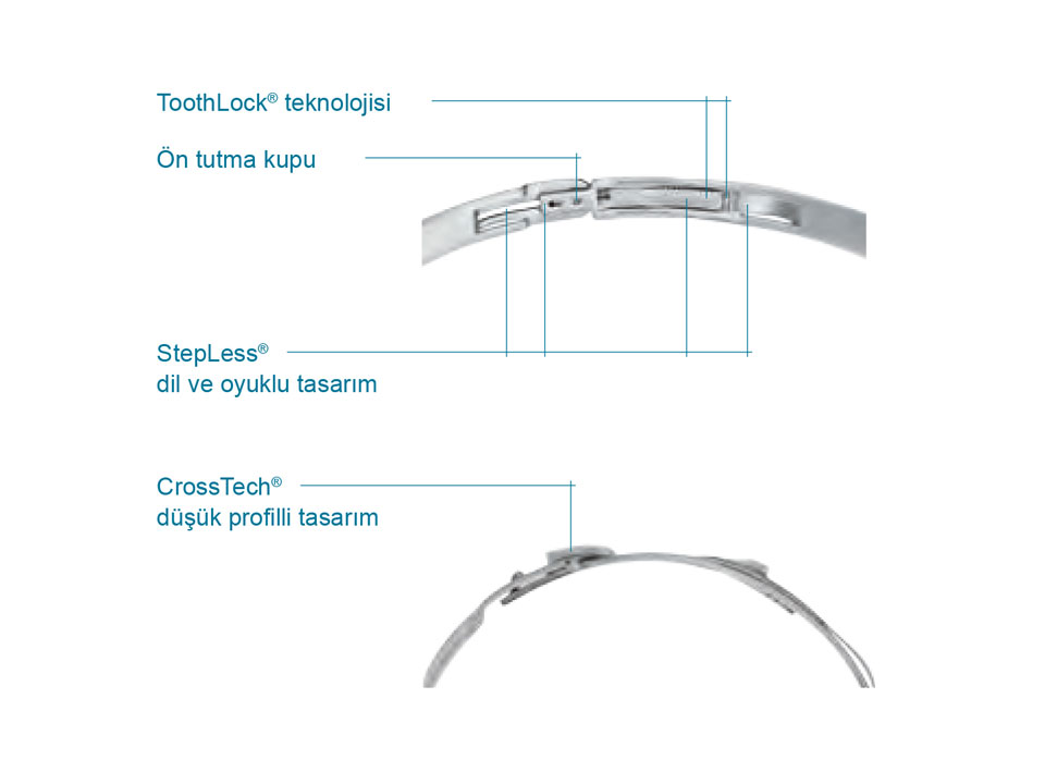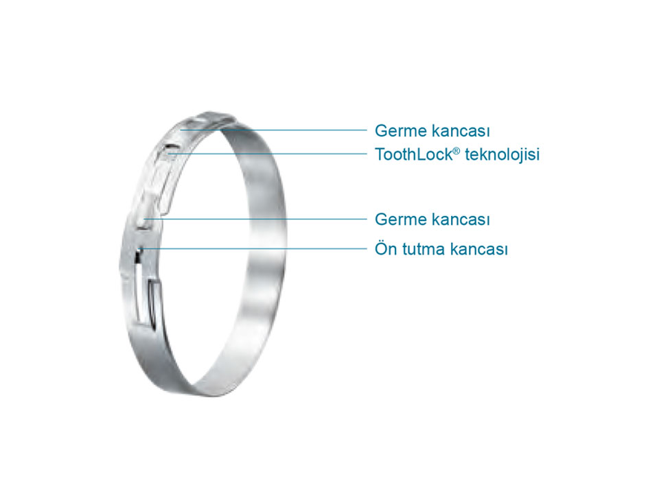 Germe Kancaları; Germe kancaları, Toothlock® düşük profilli Kelepçeyi kapatmak için kullanılan özelliklerdir.